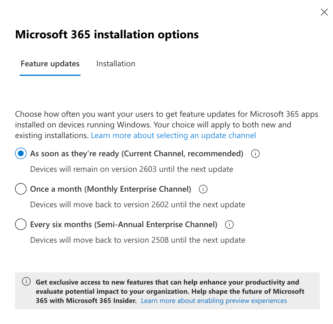 - Review your Microsoft 365 App Installation Options. Turn on the current channel updates to be on the latest app releases installed on your devices. These features all work together, so to make sure your apps can use the latest Copilot functionality, get on the rapid release track.