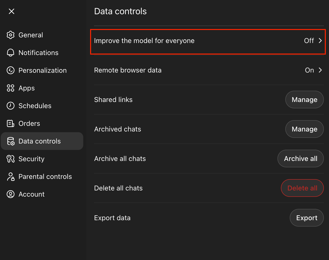 Turn off model training in ChatGPT under settings: