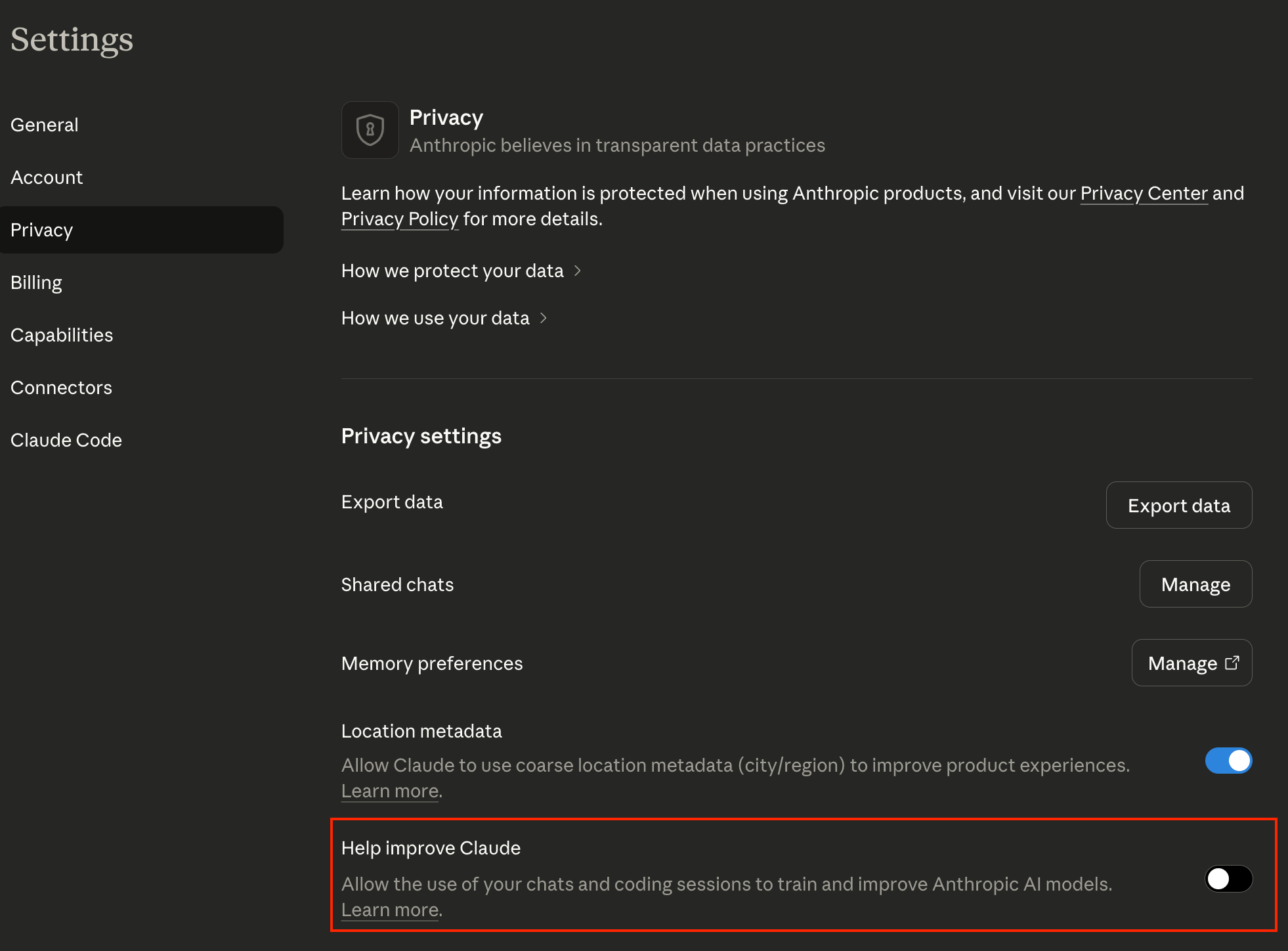Turn off model training in Claude under settings: