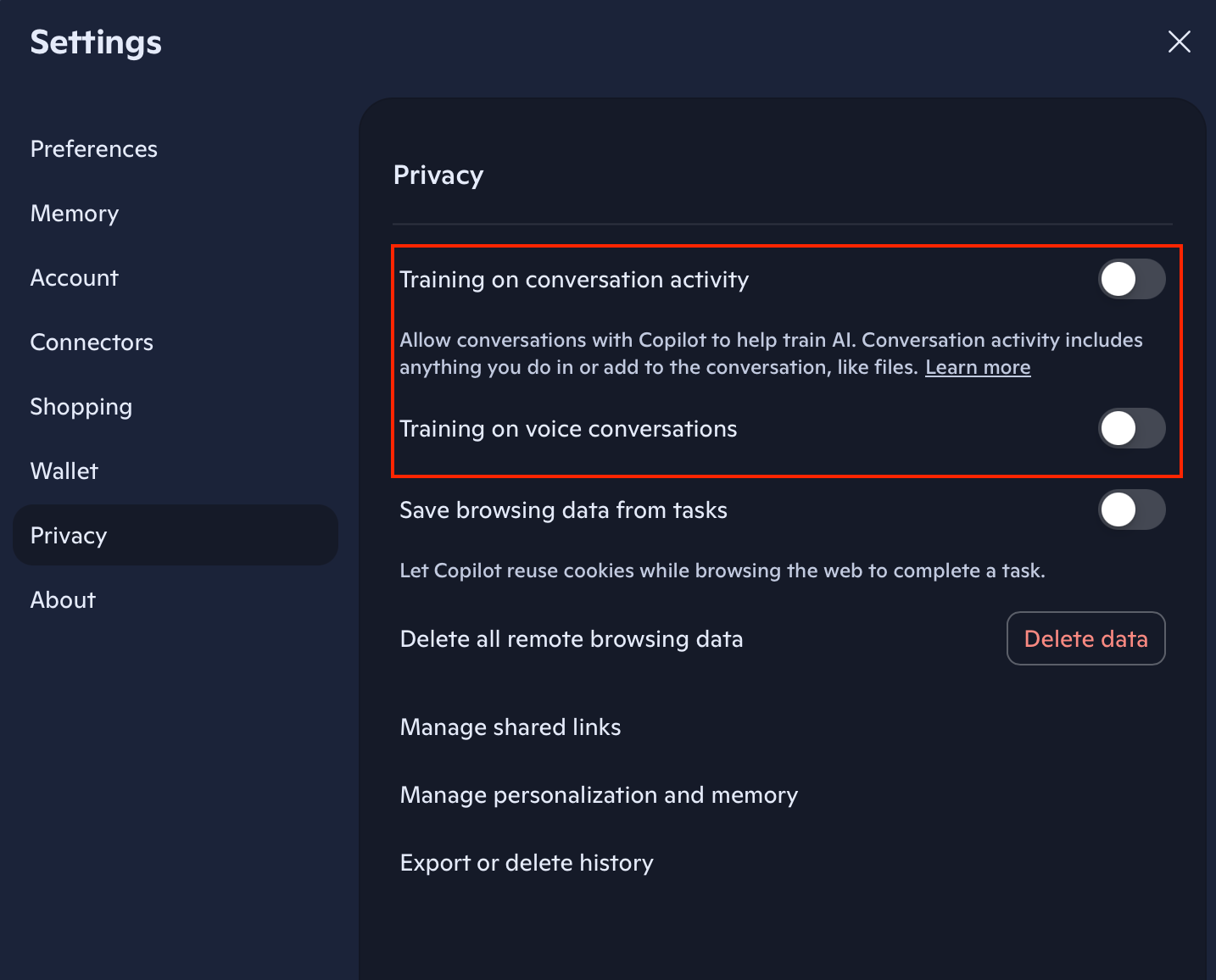 If you’re on an admin for a team or enterprise license, there is a similar toggle and additional related settings in the organization settings for these tools.